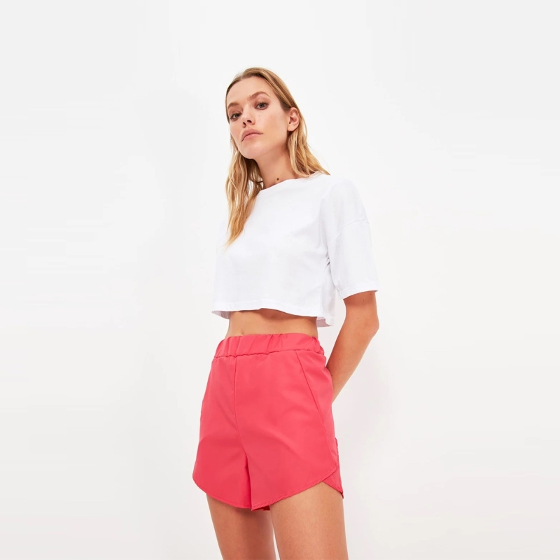شورت وردي متوسط الارتفاع ، مع حزام خصر مطاطي.