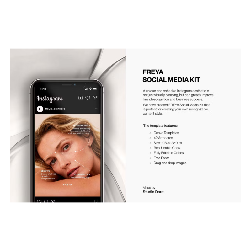 تم إنشاء مجموعة Freya Social Media Kit من Studio Dara في Canva وتتميز بجمالية بسيطة ومثالية لماركات العناية بالبشرة والجمال والمؤثرين واستوديوهات التصميم. تتضمن الحزمة 42 نموذجا فريدا بدقة 1500 × 1500 بكسل. يتصفح معظم المستخدمين خلاصات Instagram الخاصة بهم على هواتفهم - وحجم الصورة الشخصية في Instagram أساسي للجوال. تم تحسين المنشورات الشخصية لخوارزمية Instagram ويمكن أن تكون ملفتة للنظر للغاية في موجز مليء بالصور المربعة. لقد أنشأنا أنماط منشورات بورتريه مختلفة بحيث يمكنك مشاركة المنتجات والخدمات والأخبار والعروض الترويجية والاتجاهات والاقتباسات والصور النابضة بالحياة ورسائل الحث على اتخاذ إجراء والمزيد لجذب الجمهور المستهدف المناسب. وفر وقتك وأموالك وأنتج عملا عالي الجودة.